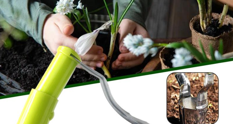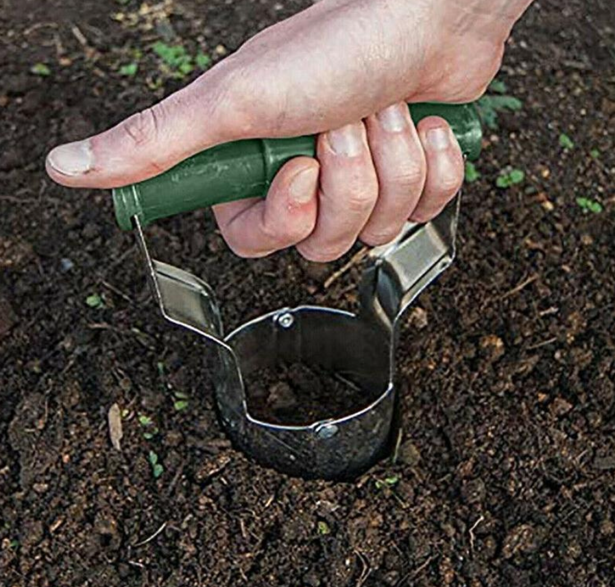 Scara gradata de pe ambele parti ale sectiunii de plantare ajuta la asigurarea profunzimii uniforme a plantarii. Arcul faciliteaza indepartarea solului sau acoperirea cu pamant a bulbului plantat.