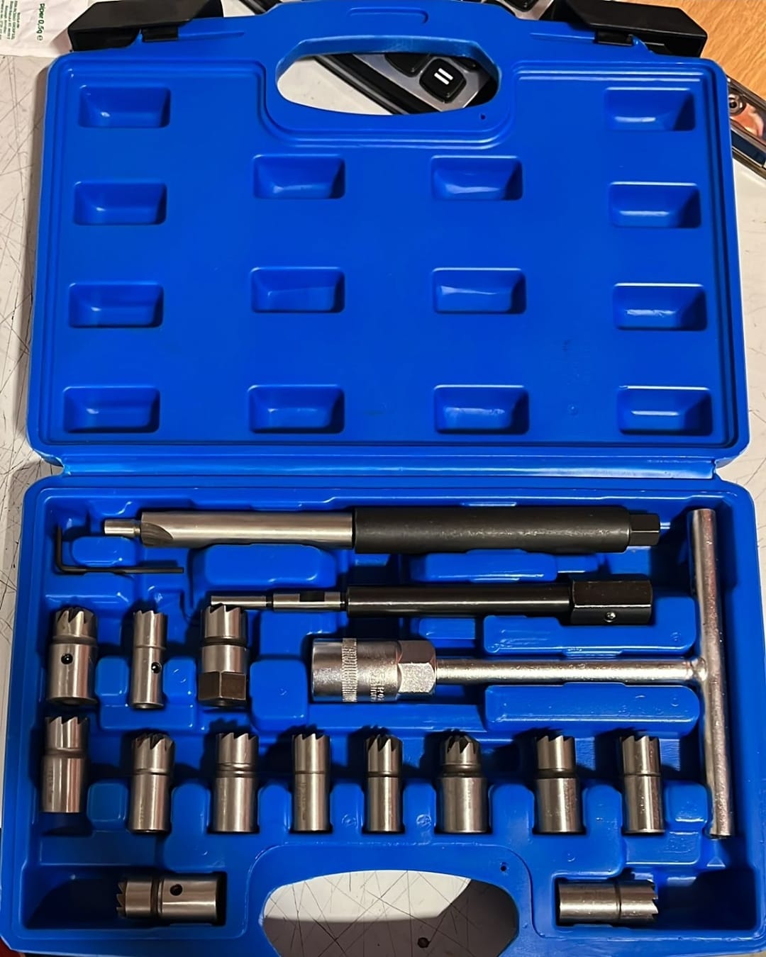 Este cea mai completa trusa cu set de freze pentru curatat orificiu injector diesel din chiuloasa compatibila cu toate tipurile de injectoare Bosch , Delphi , Denso , Siemens , etc