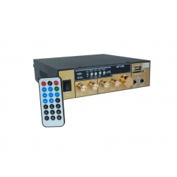 Are doua intrari pentru microfoane cu efect de voce si volum separat. Dispune de intrari USB / SD, protectie pentru boxe, etc. Se poate regla volumul, bass-ul si inaltele si contine un soclu extern de 12/DC.