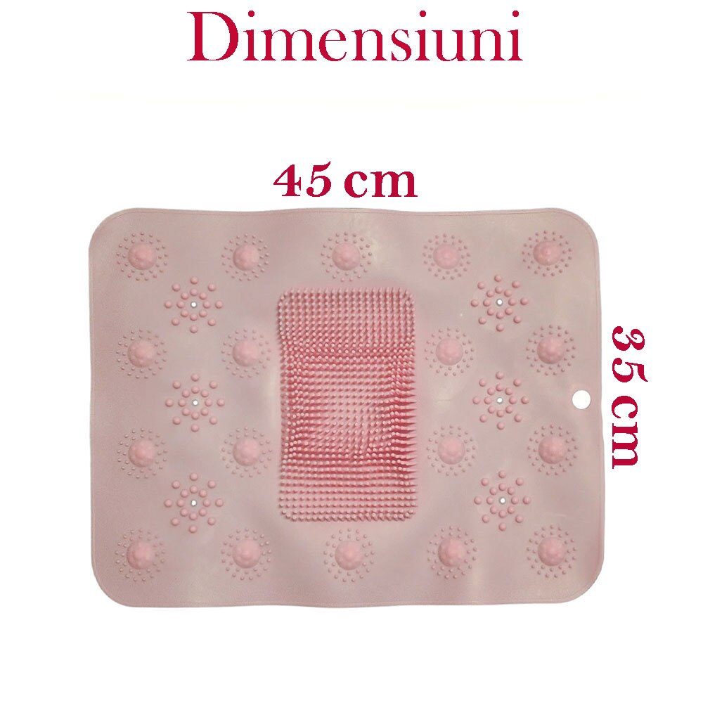 Covorasul anti-alunecare dispune de o perie pentru masaj care va ajuta la curatarea, calmarea si stimularea talpilor de fiecare data cand o folositi.
