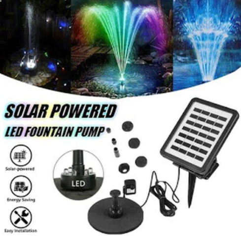 Acest kit alimentat cu energie solara este format din panou solar, pompa de apa si doua duze pentru fantani arteziene. Pompa are o capacitate de 180 L/h si cea de ridicare de 30-50 cm. Este adecvata pentru piscine si lacuri artificiale de mici dimensiuni. In zilele insorite, pompa va fi alimentata cu energie solara. Panoul solar are o putere maxima de 1.5 W. Kitul este prevazut cu doua duze cu mod de distribuire a apei diferit.