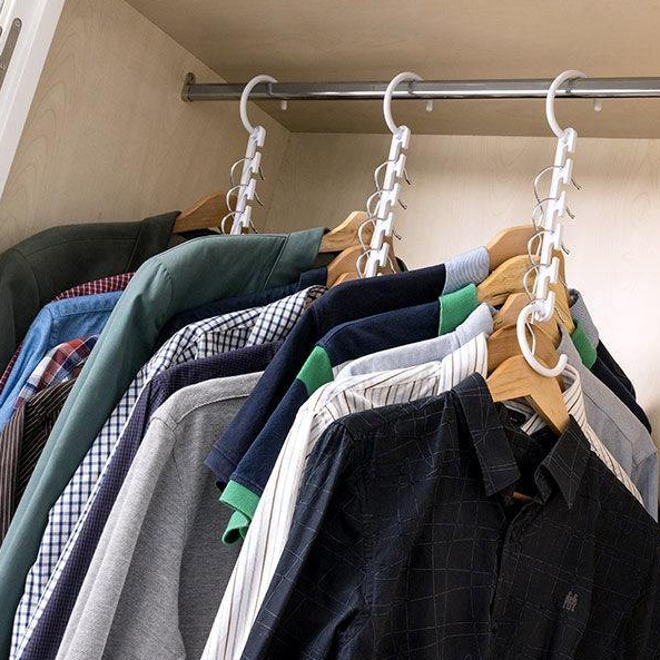 Set de aranjare a umeraselor de haine. Setul contine sisteme de agatare a umeraselor. Castigati de pana la trei ori mai mult spatiu prin depozitarea intercalata in sifonier a acestor inovatoare sisteme pentru umerase. Fiecare sistem dispune de locasuri pentru agatarea de umerase. In total, veti avea 100 de locasuri de agatat umerase. Bluzele, esarfele, fustele, pantalonii si camasile dumneavoastra nu au fost nicicand mai eficient aranjate in sifonier.