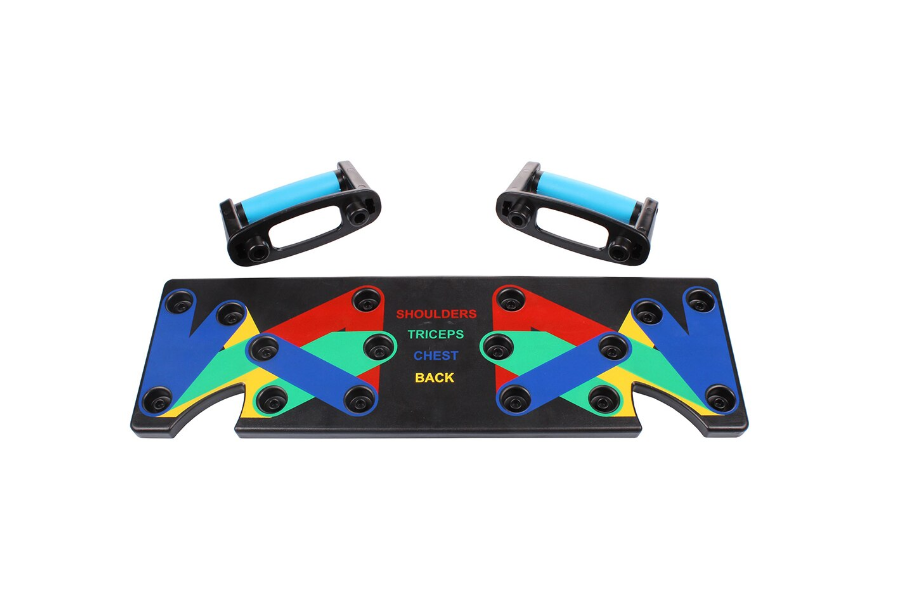 Placa ofera 10 pozitii pentru exercitii: 2 pentru umeri (culoare rosie), 3 pentru triceps (culoare verde), 3 pentru piept (culoare albastra) si 2 pentru spate (culoare galbena). Acest lucru face ca placa multifunctionala sa fie un echipament ideal si excelent pentru acasa, sali de sport sau scoli.