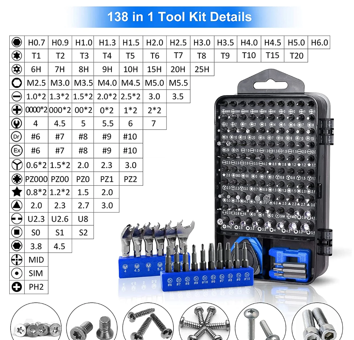 Kitul cu 117 de biti (4mm CRV steel) si 21 de instrumente de reparare: varf flexibil, prelungitor magnetic, ventuza cu stiftul de evacuare a cartelei SIM, penseta in unghi, magnetizator, covoras de proiect magnetic, spudger, instrument pentru desfacut, levier din plastic si metalic, perie praf, carpe din microfibra etc.